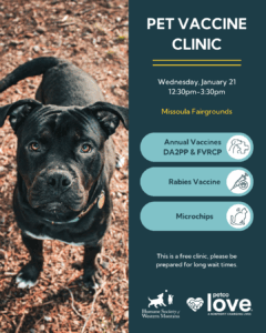 Please join us for a free vaccine clinic at the Missoula County Fairgrounds (Building 9) on January 21st. We will be providing free annual vaccines (DA2PP & FVRCP), rabies vaccines and microchips for dogs and cats. This is a free clinic, so please be prepared for long wait times. All annual vaccines have been generously donated by Petco Love.